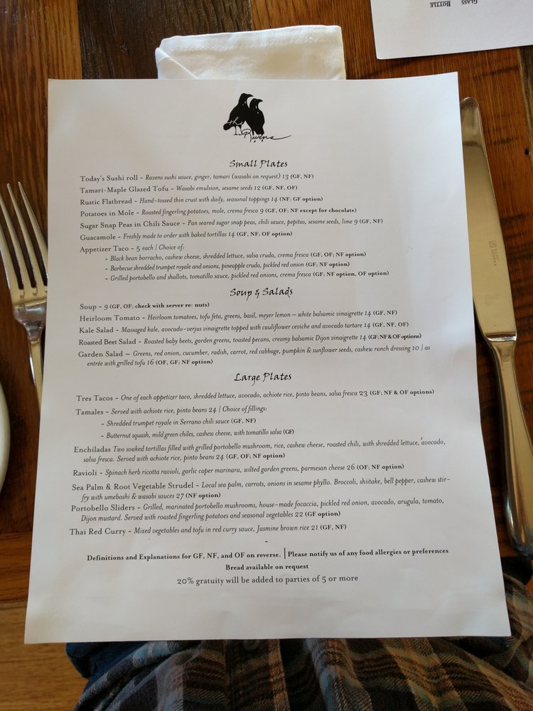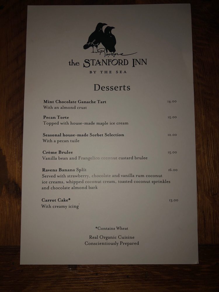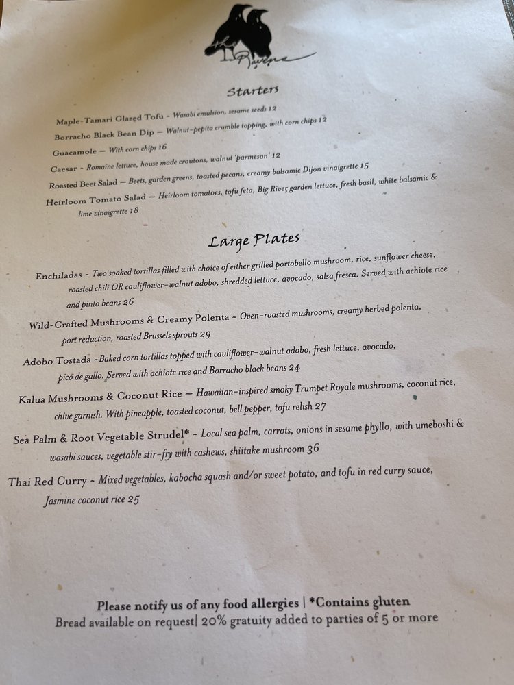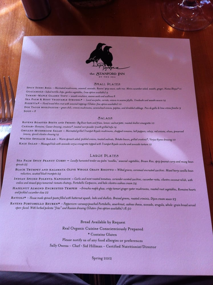 “ Six of us had dinner at Ravens. The setting is beautiful: a spacious dining room with large casement windows that open to the garden and the ocean beyond. Wood paneled walls with craftsman lighting surround. We had the Caesar salad, the beet salad, the ravioli entree, sea palm (kelp) & root vegetable strudel--all are vegan and delicious. Another welcoming note: Stanford Inn is graced by 3 mellow, gentle cats. In addition they have an impressive and eclectic bookstore. ”